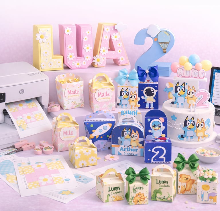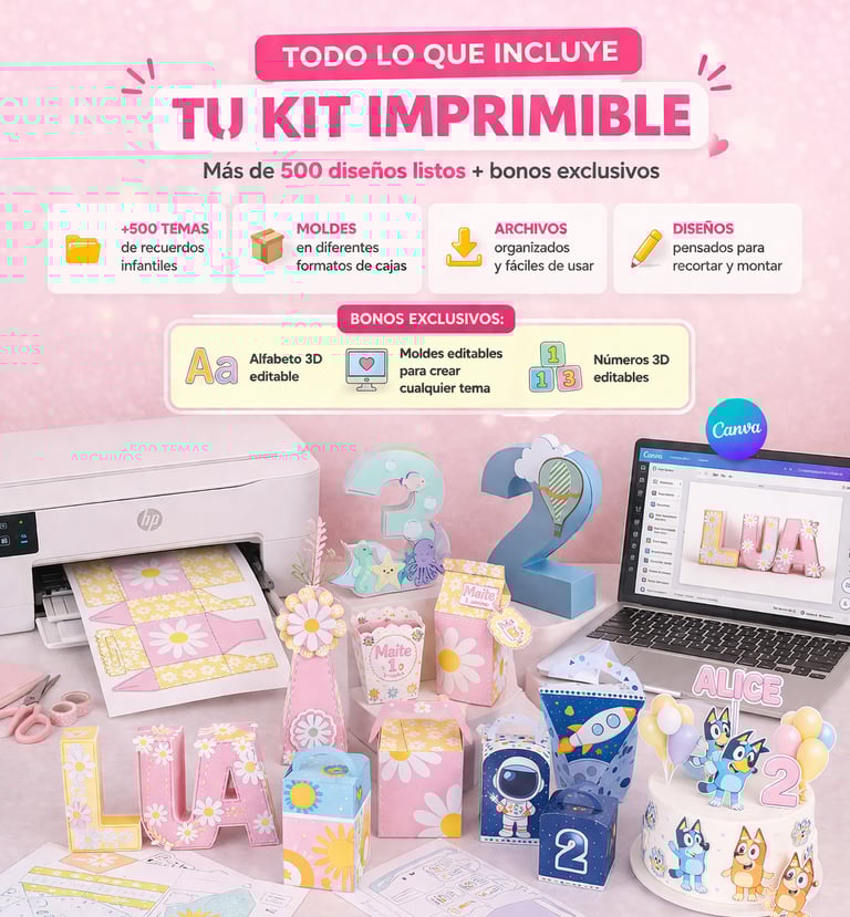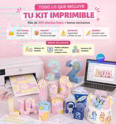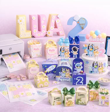 Incluye cajitas, toppers y decoraciones inspiradas en los temas más populares de fiestas infantiles, para crear una celebración hermosa, fácil y sin gastar mucho.